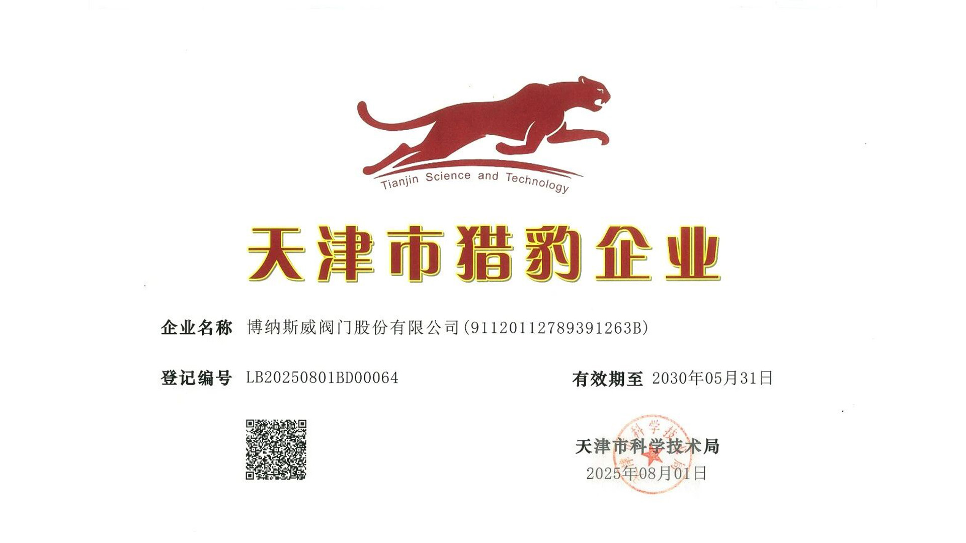 近日,博纳斯威成功获得天津市科学技术局颁发的“天津市猎豹企业”荣誉证书。