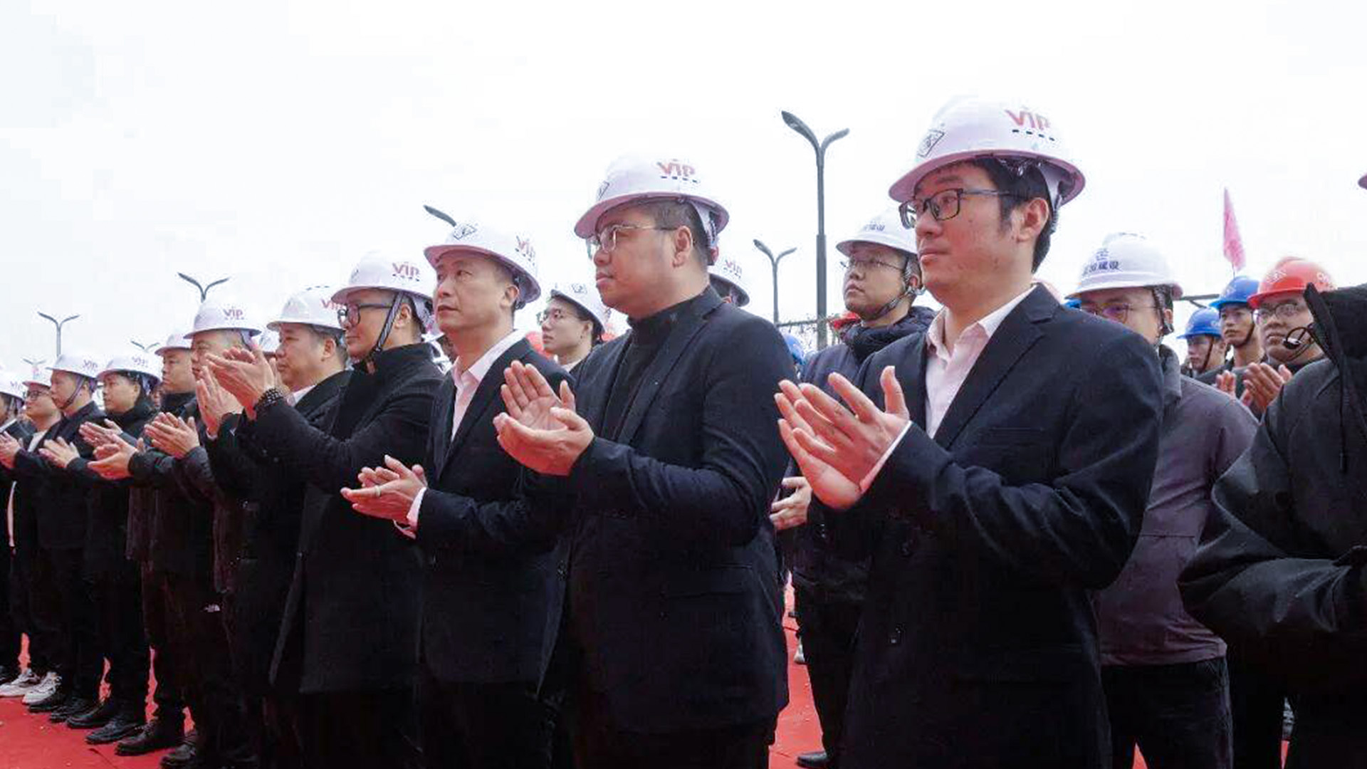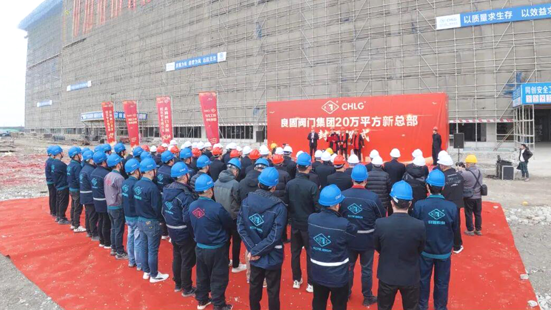 封顶仪式当天,现场气氛庄重而热烈。良固阀门集团董事长潘成桃、总裁潘成涨、总经理潘成晓等董事会成员,与来自各生产基地、分公司及员工代表齐聚一堂,共同见证集团发展历程中的重要时刻。