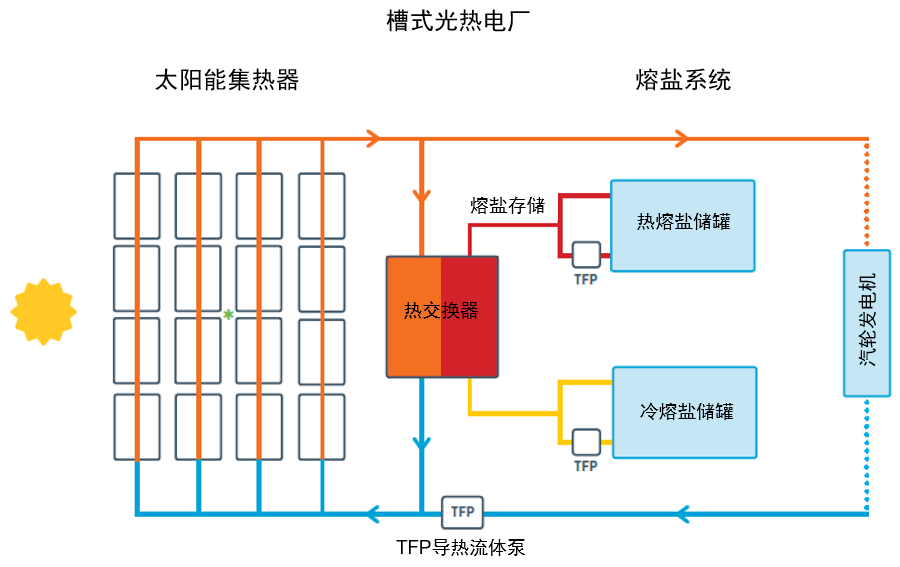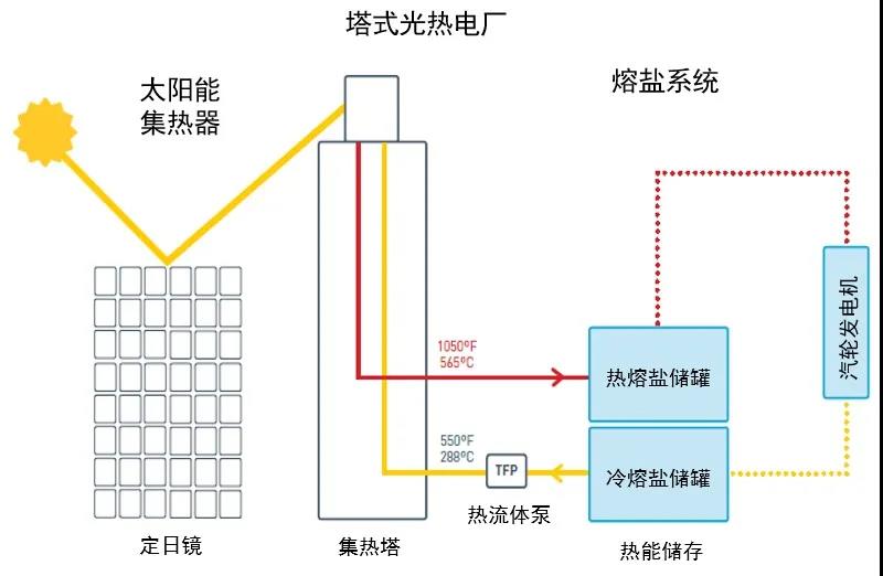 太阳能光热发电的工作原理,是将太阳能聚集起来,加热工质,驱动汽轮发电机即能发电。传热蓄热工质是储能系统的关键,导热油和熔盐均可作为工质,但导热油系统蓄热温区和蒸汽温度均较熔盐系统低140-170℃左右,而高温蒸汽参数可使发电站发电效率增加约4%,年发电量提高15%,效益可观。实践证明,低熔点熔盐越来越成为更多光热发电公司的选择。