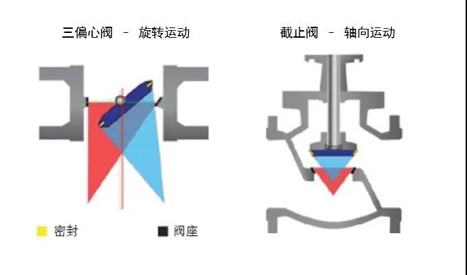 图2 三偏心蝶阀和截止阀的阀座结构比较