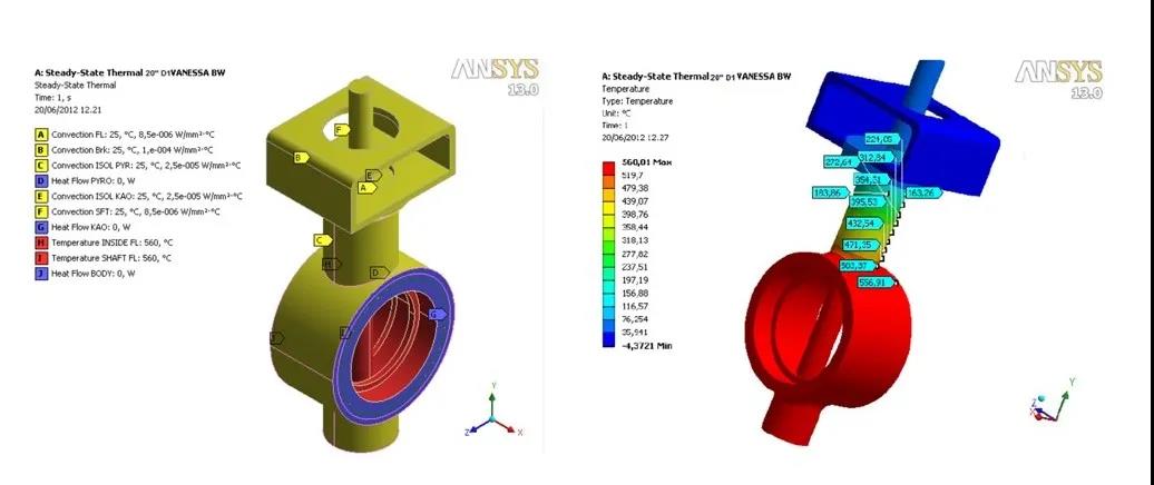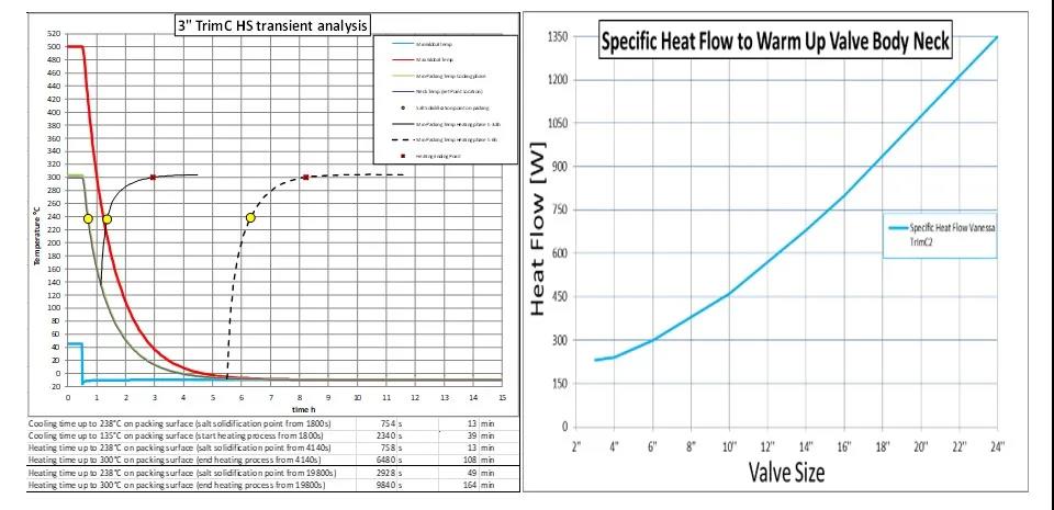 熔盐的缺点在于较低的凝固点,用于传热系统时最大的风险就是集热管、管道的堵塞或开裂。资深熔盐阀门制造商或设计院根据热传导原理的傅里叶定律、对流换热的基本规律牛顿冷却公式、物体辐射热流量斯忒潘-波尔兹曼定律等等进行电伴热需求功率计算,通常使用ANSYS软件进行电伴热功率和参数模拟计算,依据现场的工作和环境建立适合的边界条件,模拟计算冷熔盐和热熔盐阀门的进盐过程 (Transient State) 和日常运行过程 (Steady State) 中升温/保温所需要的最低功率。最终计算出每台熔盐阀的稳态热分析 (阀颈、阀腔以及阀根部在日常运行中需要保温的电伴热功率) 和瞬时热态分析 (如装置开车时的进盐过程中需要热管/阀门的电伴热功率),作为现场电伴热系统的设计以及安装指导。只有通过精确计算后的电伴热系统设计才能有效避免熔盐阀结晶堵塞问题,并大大节省电能。