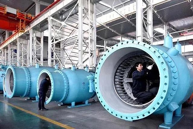 大口径车间员工正在加工1.8米调流阀