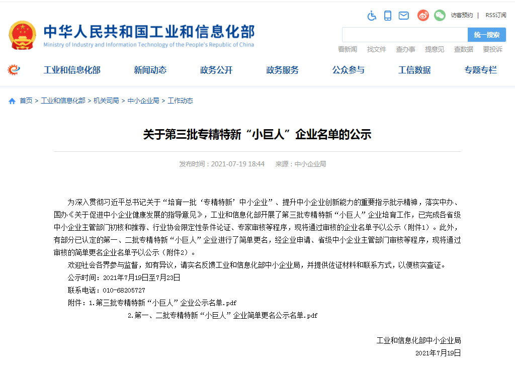 7月19日,国家工信部发布专精特新“小巨人”企业名单,我司成功入选!“专精特新”是指“专业化、精细化、特色化、新颖化”,“专精特新小巨人”企业是层层筛选出来的的佼佼者,是专注于细分市场、创新能力强、市场占有率高、掌握关键核心技术、质量效益优的排头兵企业。