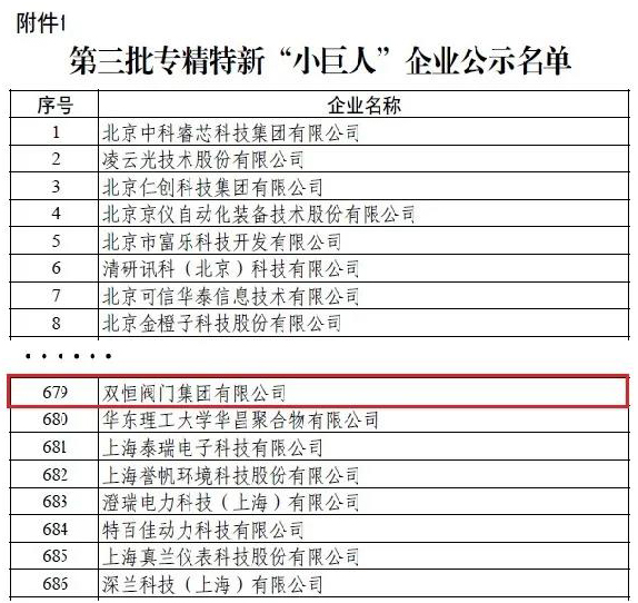 双恒阀门集团被评为“国家工信部专精特新小巨人企业”!
