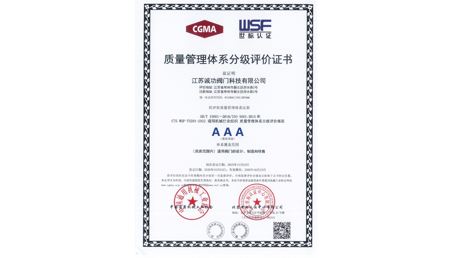 江苏诚功阀门科技有限公司凭借卓越的质量管理体系和过硬的产品品质,正式通过GB/T 19001—2016/ISO 9001:2015及CTS WSF-TS201-2022标准认证,荣获质量管理体系分级评价最高等级——AAA级认证证书!这一重要资质的获得,标志着诚功阀门在通用阀门设计、制造和销售领域的质量管理水平已达到行业领先水准。