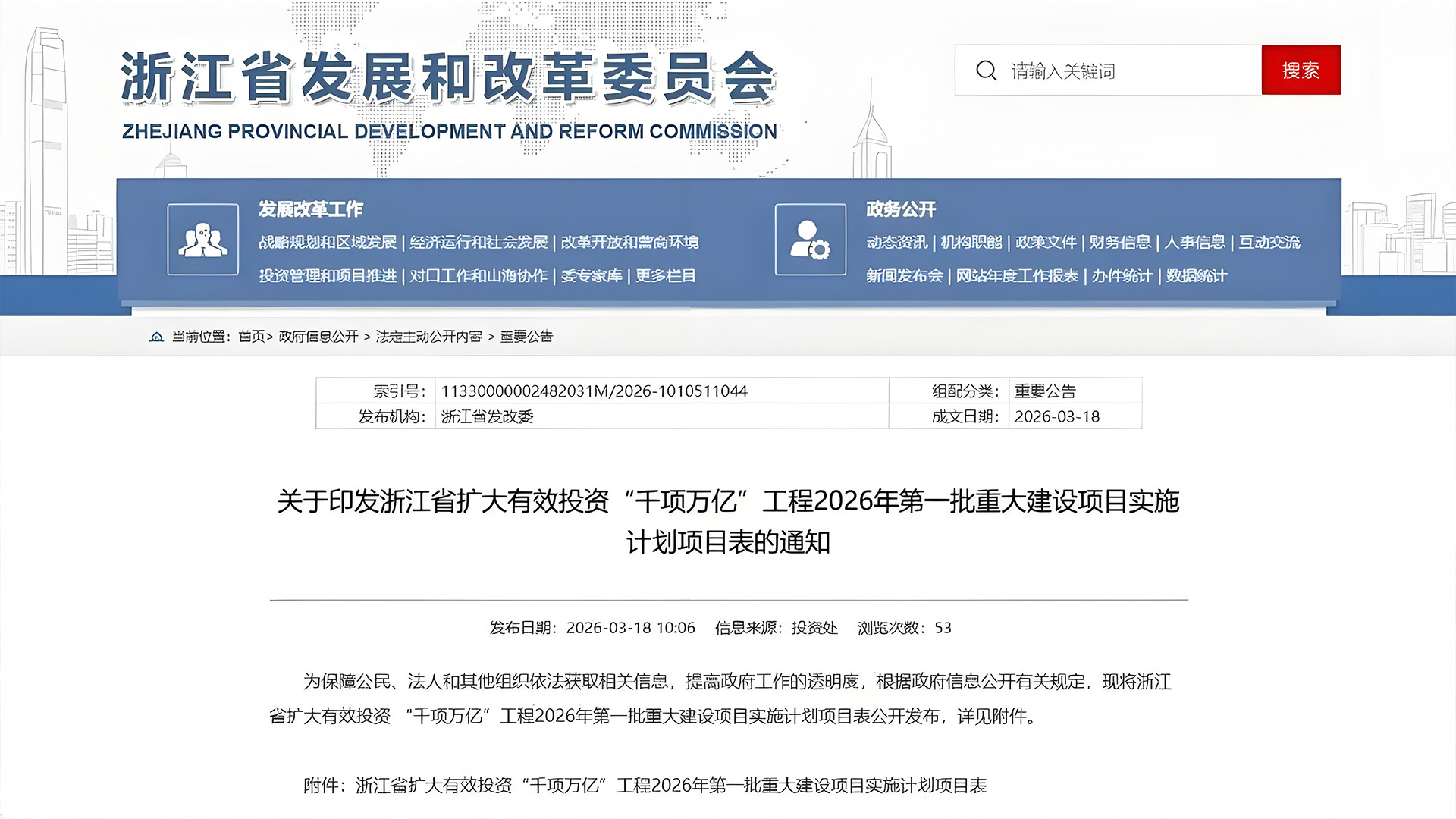 近日,浙江省发展改革委发布《浙江省扩大有效投资“千项万亿”工程2026年第一批重大建设项目实施计划项目表》,标志着新一轮重大项目建设全面启动。该批项目覆盖先进制造业、科技创新、数字经济、清洁能源等多个重点领域,进一步强化重大项目对经济高质量发展的支撑作用。